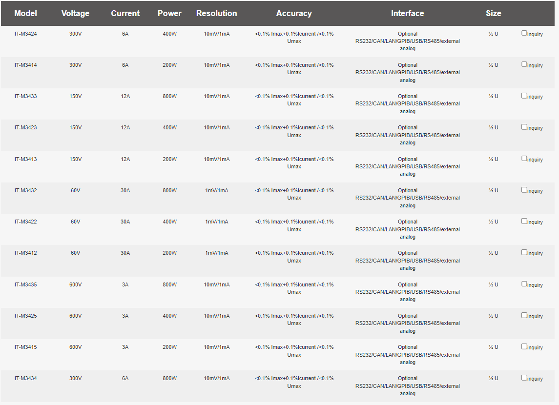 IT-M3400은 1U 하프랙 미니 사이즈로 최대 800W의 출력을 지원하며, 높은 전력 밀도뿐만 아니라 고해상도, 고정밀도, 높은 안정성을 갖추고 있습니다. 출력 전압은 600V에 도달할 수 있고 출력 전류는 30A에 도달할 수 있습니다. 전체 시리즈에는 12가지 모델이 있으며, 광범위한 출력 설계가 가능하며, 하나의 유닛으로 광범위한 애플리케이션을 커버할 수 있습니다.