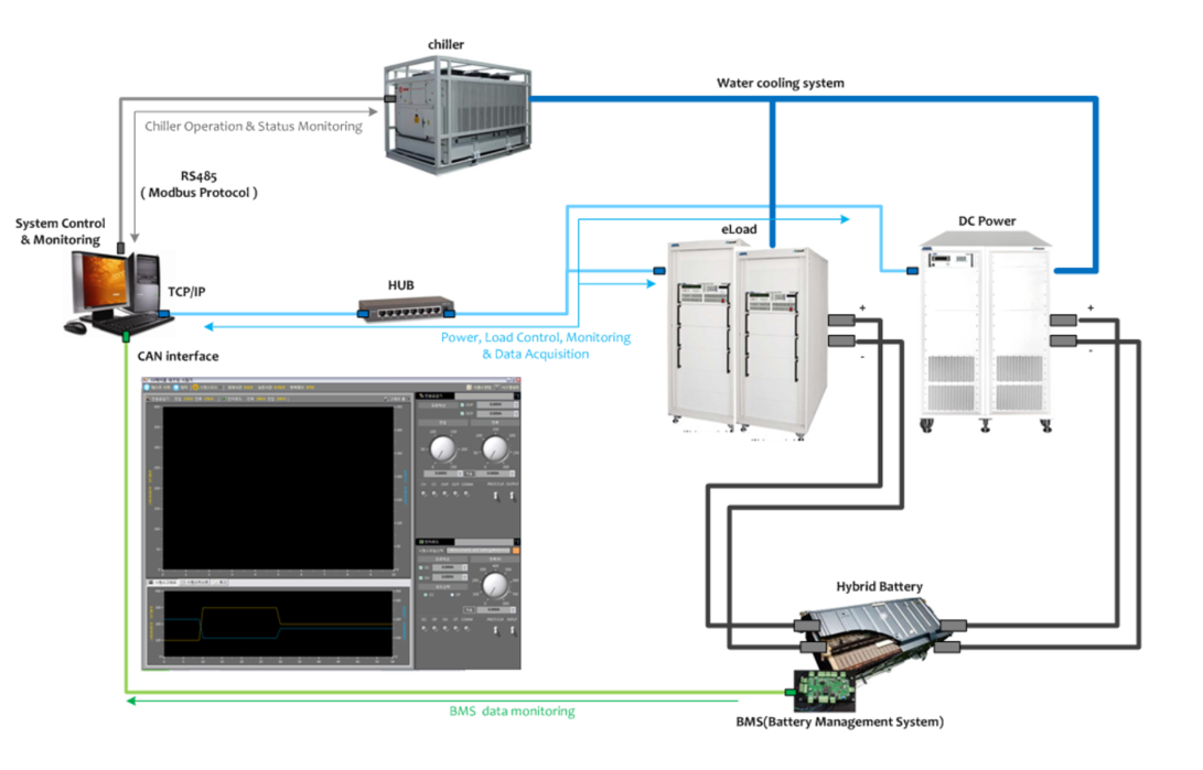 배터리 PACK/MODULE 충, 방전 시험을 진행하면서 배터리의 전압, 전류 및 온도 데이터를 계측 장치와 BMS로 부터 실시간