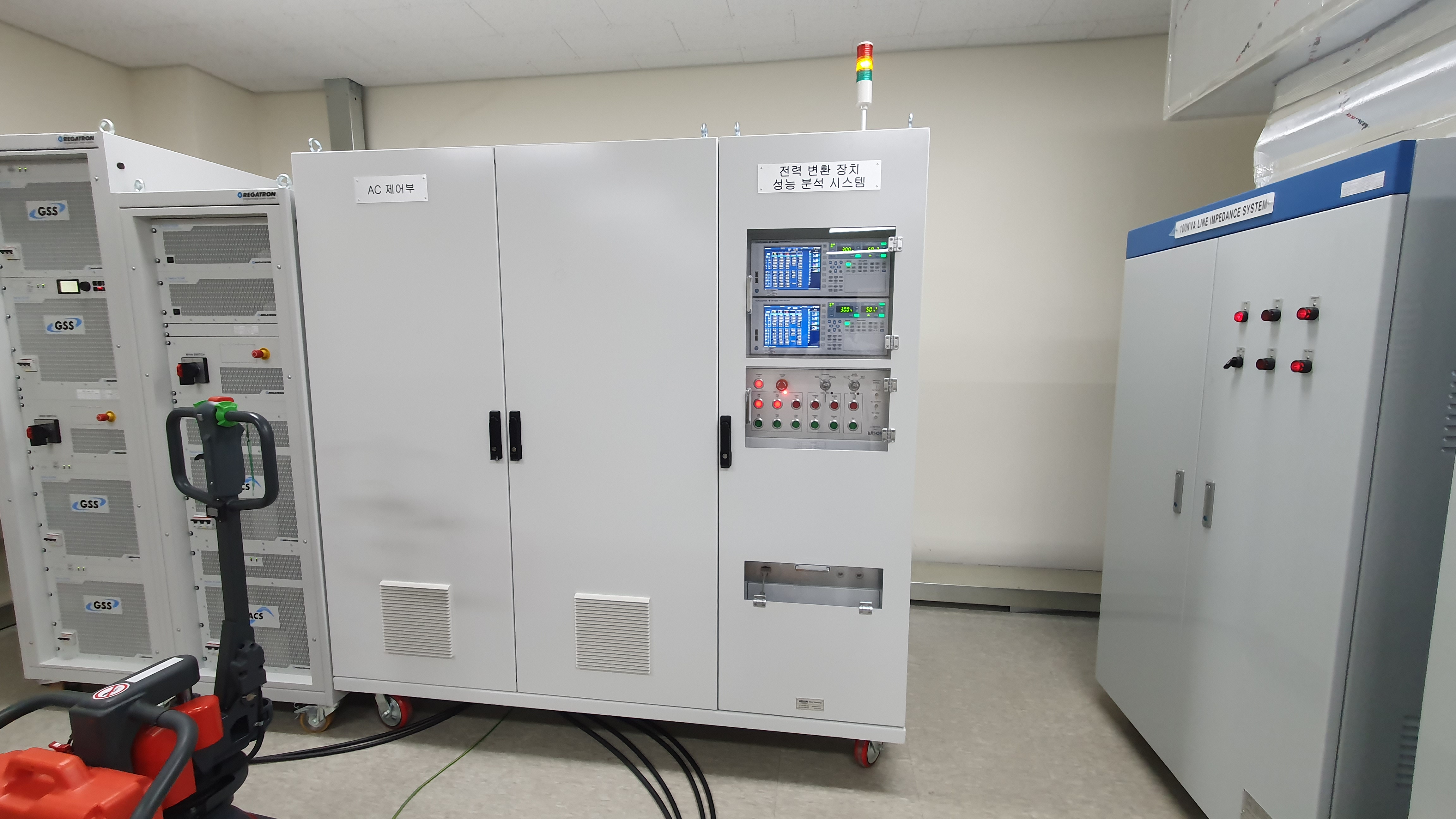 500kW 친환경 선박 추진체계 내환경 및 안정성 평가 시험설비 구축•설비 개요 : - 다양한 형태의 친환경에너지로 인한 분산에너지자원(Distributed Energy Resources) 환경에서의 상호연결 및 상호운용을 위한 전력변환용 컨버터, 인버터, 제어기와 같은 시스템장비의 모의전원환경을 구축하여 EUT의 전기적 안정성 및 성능을 평가. - IEEE1547, UL1741 규격에서는 이러한 ESS 및 분산에너지자원환경에서의 인버터, 컨버터, 제어기 및 시스템장비의 규격을 적용하고 있으며 IEC 국제전기규격에서는 에너지원의 전압변동, 정전, 주파수변동, 전원왜곡 환경에서의 EUT의 내성 및 성능을 평가하기 위해 계측기술 및 시험방법을 표준화.•납품처 : 한국조선해양기자재연구•관련 규격 시험 - SGSF-025-4 : 전기에너지저장시스템용 전력변환장치 성능 요구 사항 - UL1741 : 분산에너지 자원에서 사용을 위한 인버터, 컨버터, 컨트롤러 및 상호 연결 시스템 장비에 대한 표준 - IEEE1547 : 분산 에너지 자원의 상호 연결 및 상호 운용성을 위한 IEEE 표준 - EN50438, EN50549-2 : 분산 에너지 계통연계 유럽 연합 표준. - IEC 61000-4-11, IEC61000-4-13. IEC61000-4-28 등..문의 및 접수㈜위슨테크놀로지는 산업용 시험 솔루션 설계·제작 경험을 바탕으로고객 요구에 최적화된 시험 서비스를 제공하며,다양한 전력·전자 장비의 성능과 신뢰성을 정확하게 검증합니다.