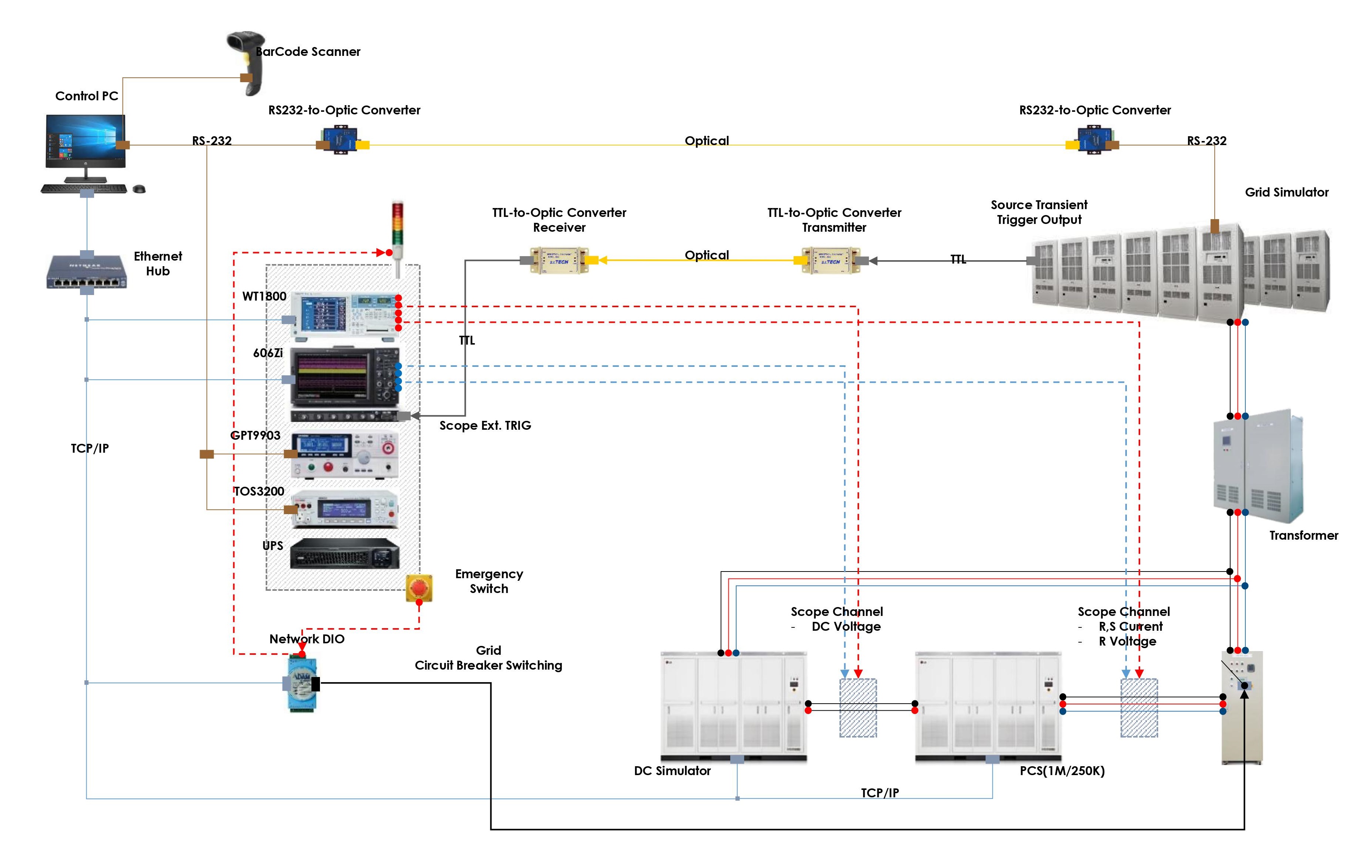 250kW급 ESS PCS 검사 자동화 시험 시스템 구축•설비 개요 : - 다양한 형태의 친환경에너지로 인한 분산에너지자원(Distributed Energy Resources) 환경에서의 상호연결 및 상호운용을 위한 전력변환용 컨버터, 인버터, 제어기와 같은 시스템장비의 모의전원환경을 구축하여 EUT의 전기적 안정성 및 성능을 평가. - IEEE1547, UL1741 규격에서는 이러한 ESS 및 분산에너지자원환경에서의 인버터, 컨버터, 제어기 및 시스템장비의 규격을 적용하고 있으며 IEC 국제전기규격에서는 에너지원의 전압변동, 정전, 주파수변동, 전원왜곡 환경에서의 EUT의 내성 및 성능을 평가하기 위해 계측기술 및 시험방법을 표준화.•납품처 : LG전자 ESS PCS 사업부•시험 종류 - 통신 테스트, I/O 테스트, AD정밀도, FAN RPM, AC 초중, 충방전, System Protection, EPS시험, 역상보호, 절연시험, 보호기능 시험 등등 업체에 맞춘 시험 시나리오에 따라 검사 자동화 실행•관련 규격 시험 - SGSF-025-4 : 전기에너지저장시스템용 전력변환장치 성능 요구 사항 - UL1741 : 분산에너지 자원에서 사용을 위한 인버터, 컨버터, 컨트롤러 및 상호 연결 시스템 장비에 대한 표준 - IEEE1547 : 분산 에너지 자원의 상호 연결 및 상호 운용성을 위한 IEEE 표준 - EN50438, EN50549-2 : 분산 에너지 계통연계 유럽 연합 표준. - IEC 61000-4-11, IEC61000-4-13. IEC61000-4-28 등.문의 및 접수㈜위슨테크놀로지는 산업용 시험 솔루션 설계·제작 경험을 바탕으로고객 요구에 최적화된 시험 서비스를 제공하며,다양한 전력·전자 장비의 성능과 신뢰성을 정확하게 검증합니다.